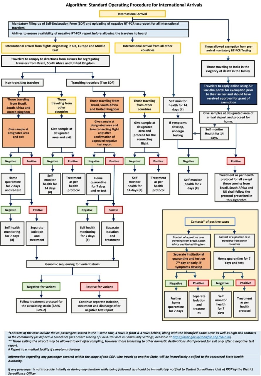 Los viajeros internacionales en estadías cortas (menos de 14 días) y que hayan dado negativo en la prueba y permanezcan libres de síntomas, deberán someterse a todos los procedimientos mencionados anteriormente y se les permitirá salir de la India bajo la debida información a las autoridades de salud de su distrito / estado, sujeto a que cumplan el requisito de las aerolíneas y el país de destino.
